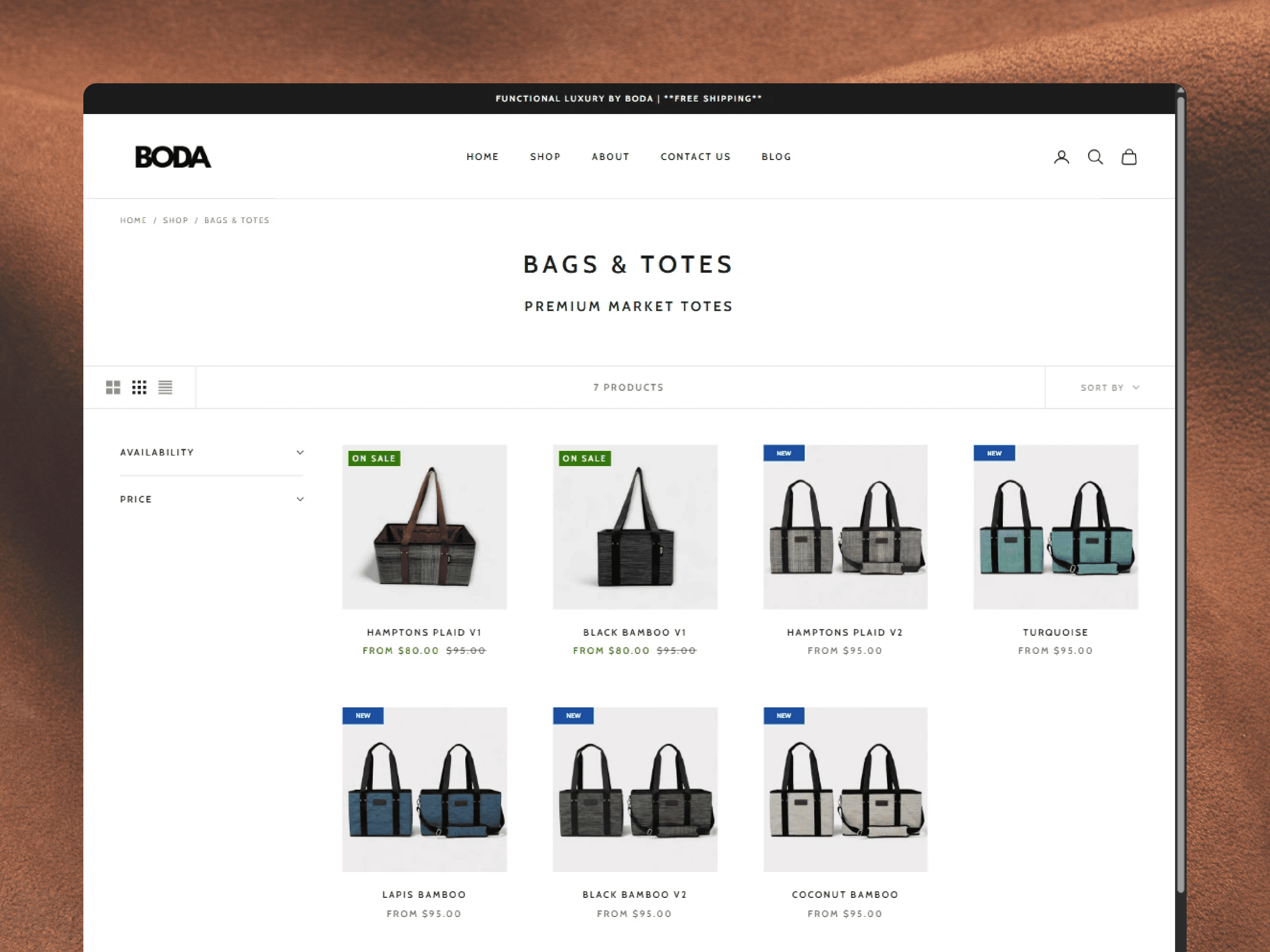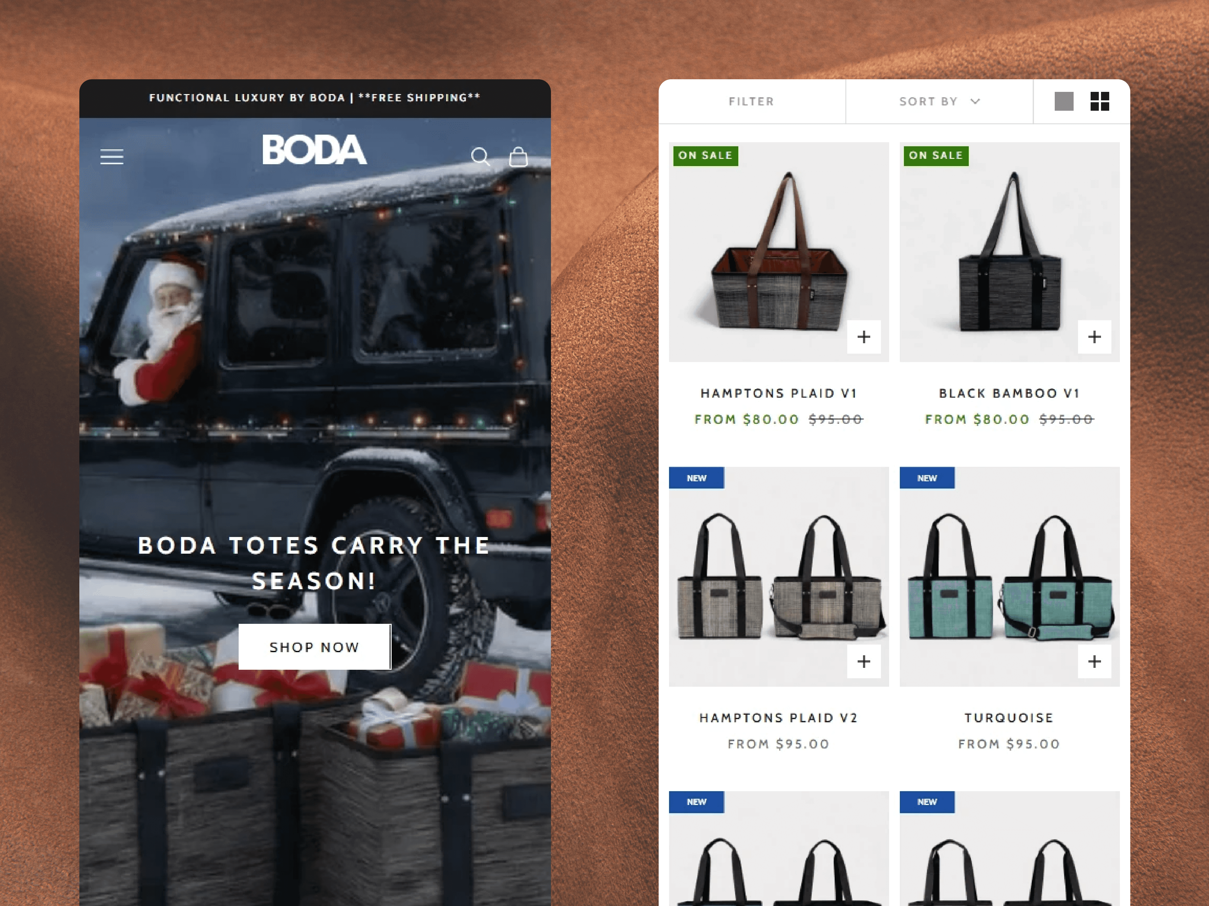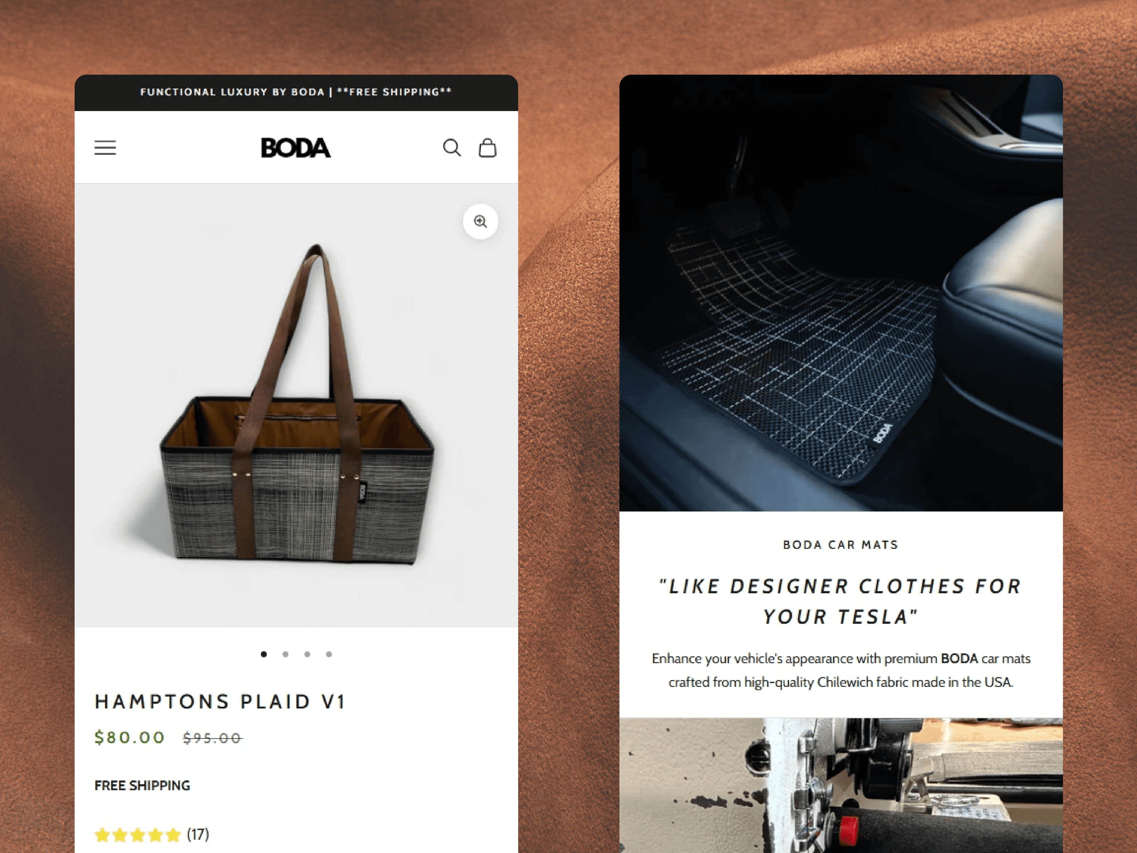 We worked on several elements of BODA's store, including color, typography, and imagery, while also restructuring many of the site's core pages. Our work preserved the brand's integrity while creating a new UX that was designed to delight customers. The new site was built to be elegant, functional, and aligned with BODA's commitment to craftsmanship and responsible manufacturing. We also integrated key apps like Shopify Search & Discovery and Judge.me Product Reviews to enhance site functionality and build customer trust.