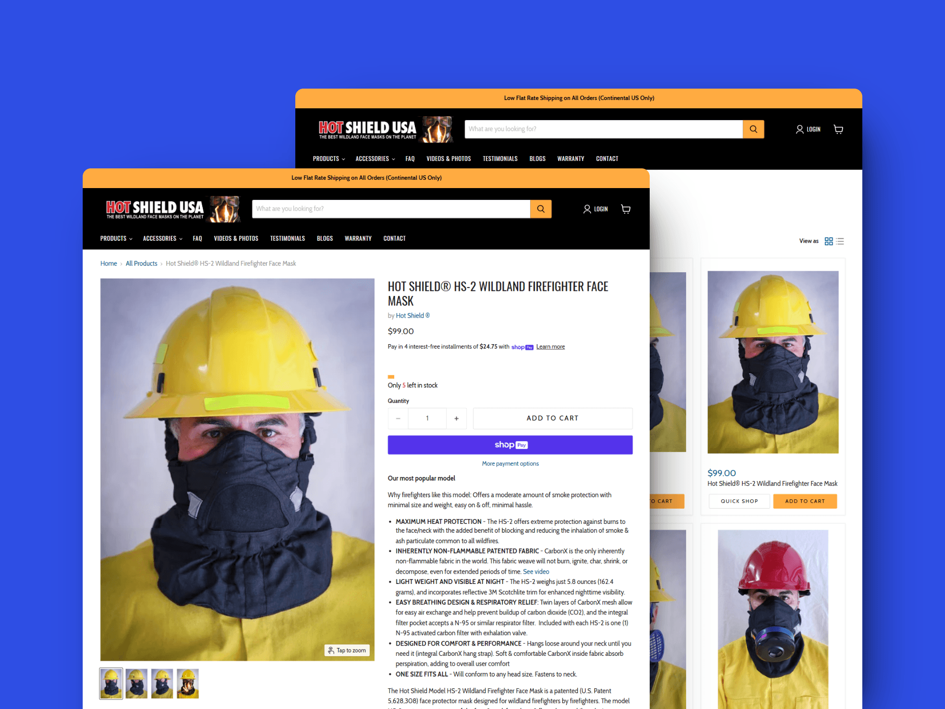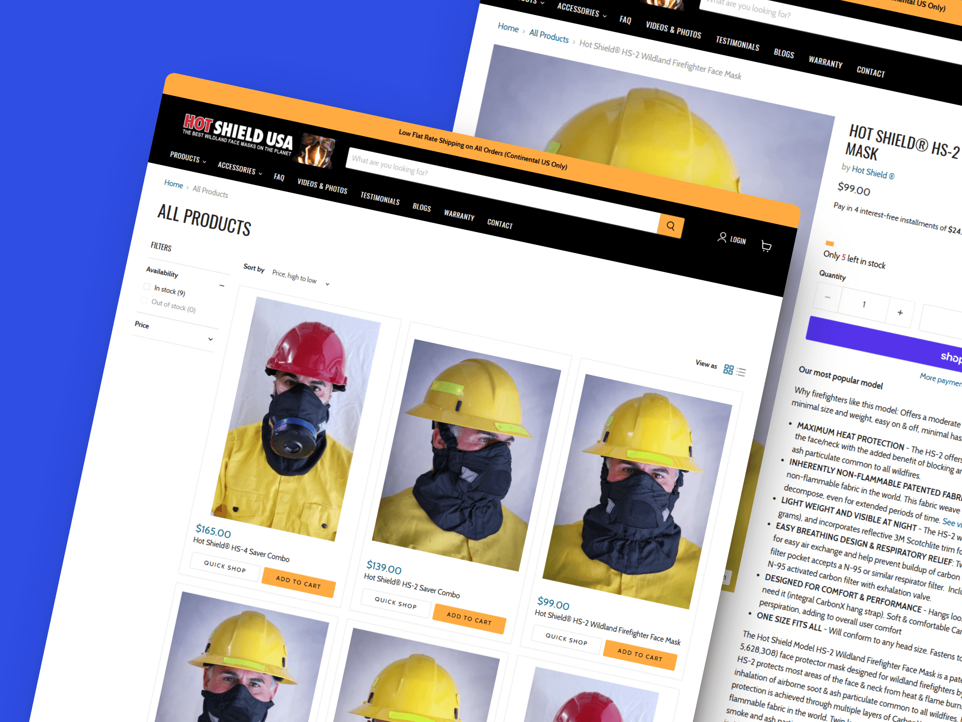 We designed and developed a professional Shopify webstore for Hot Shield®, ensuring a seamless and intuitive user experience that reflects the brand’s mission to provide protective gear for firefighters and rescue teams. To enhance the site’s functionality, we implemented custom JavaScript solutions and advanced Shopify Liquid modifications, tailoring the store to meet the brand’s specific needs. Additionally, we designed high-quality visual assets that align with Hot Shield®’s identity, creating a cohesive and impactful online presence that highlights their innovative safety products.