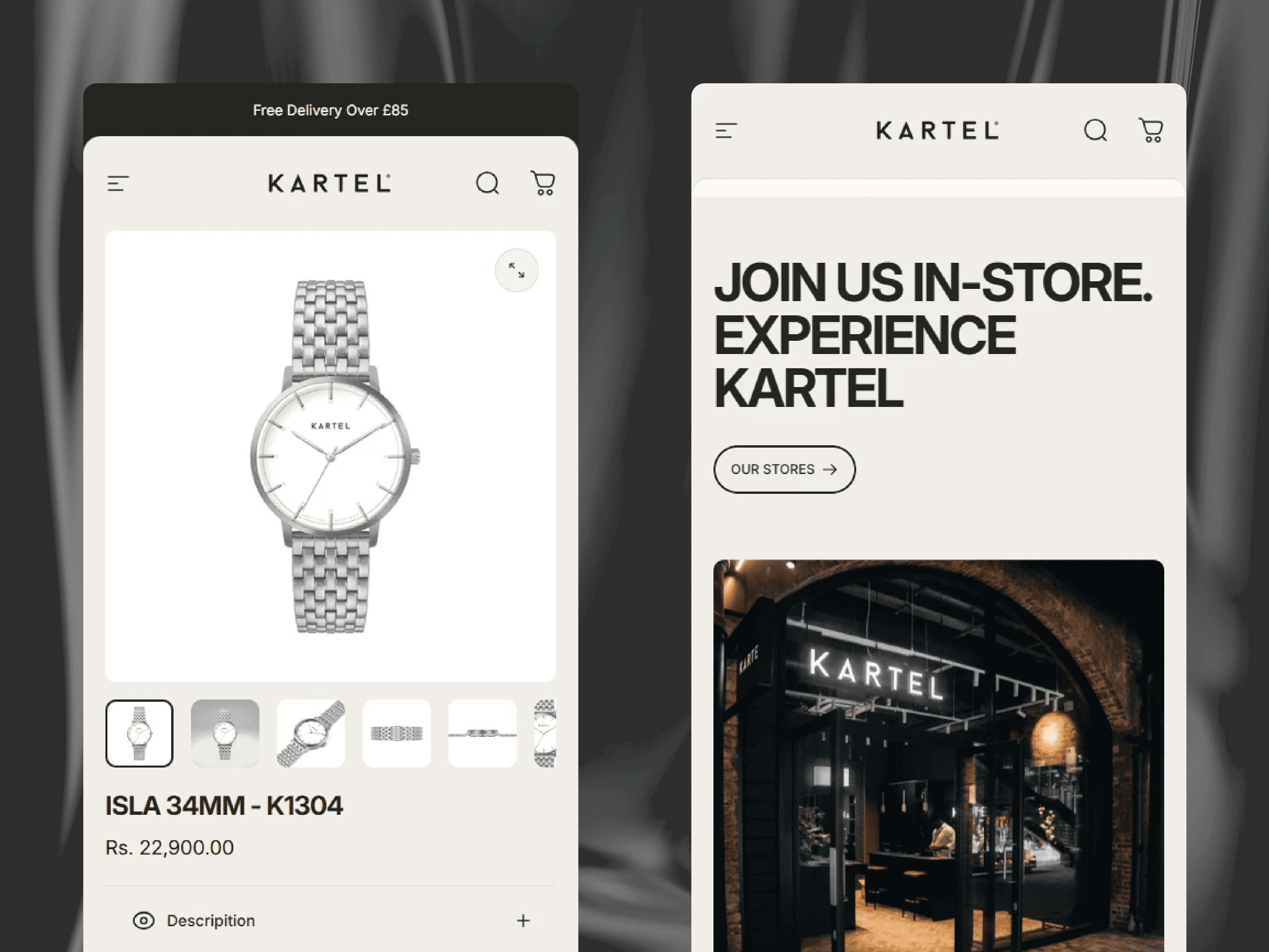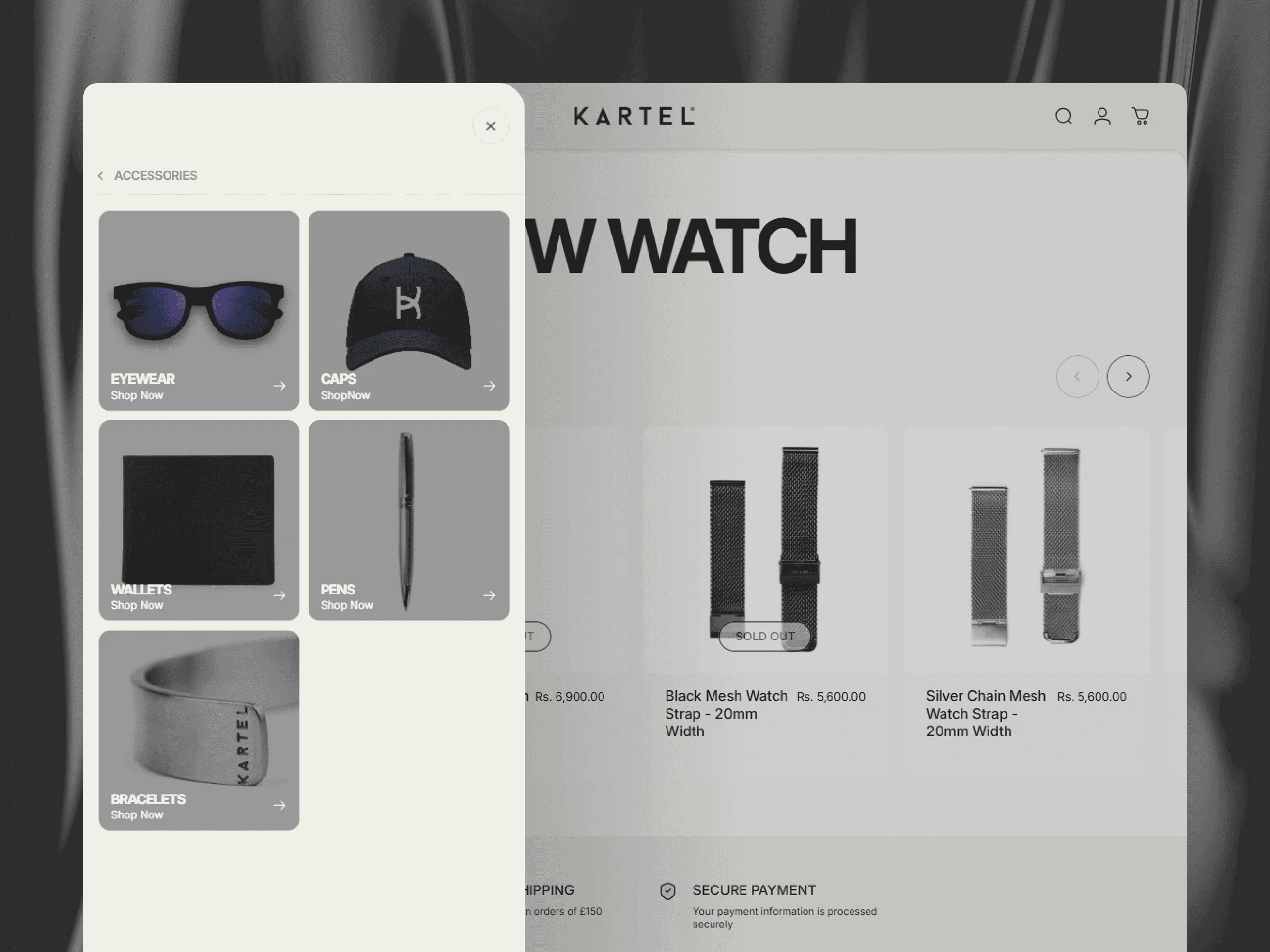 We structured the site with clear and engaging navigation, segmenting it into Watches, Experiences, Accessories, Gift Cards, and About. This intuitive layout made it easy for customers to discover both products and experiential offerings. Each collection page was carefully curated to reinforce Kartel’s narrative of craftsmanship and authenticity, helping to strengthen the emotional connection between the brand and its audience.