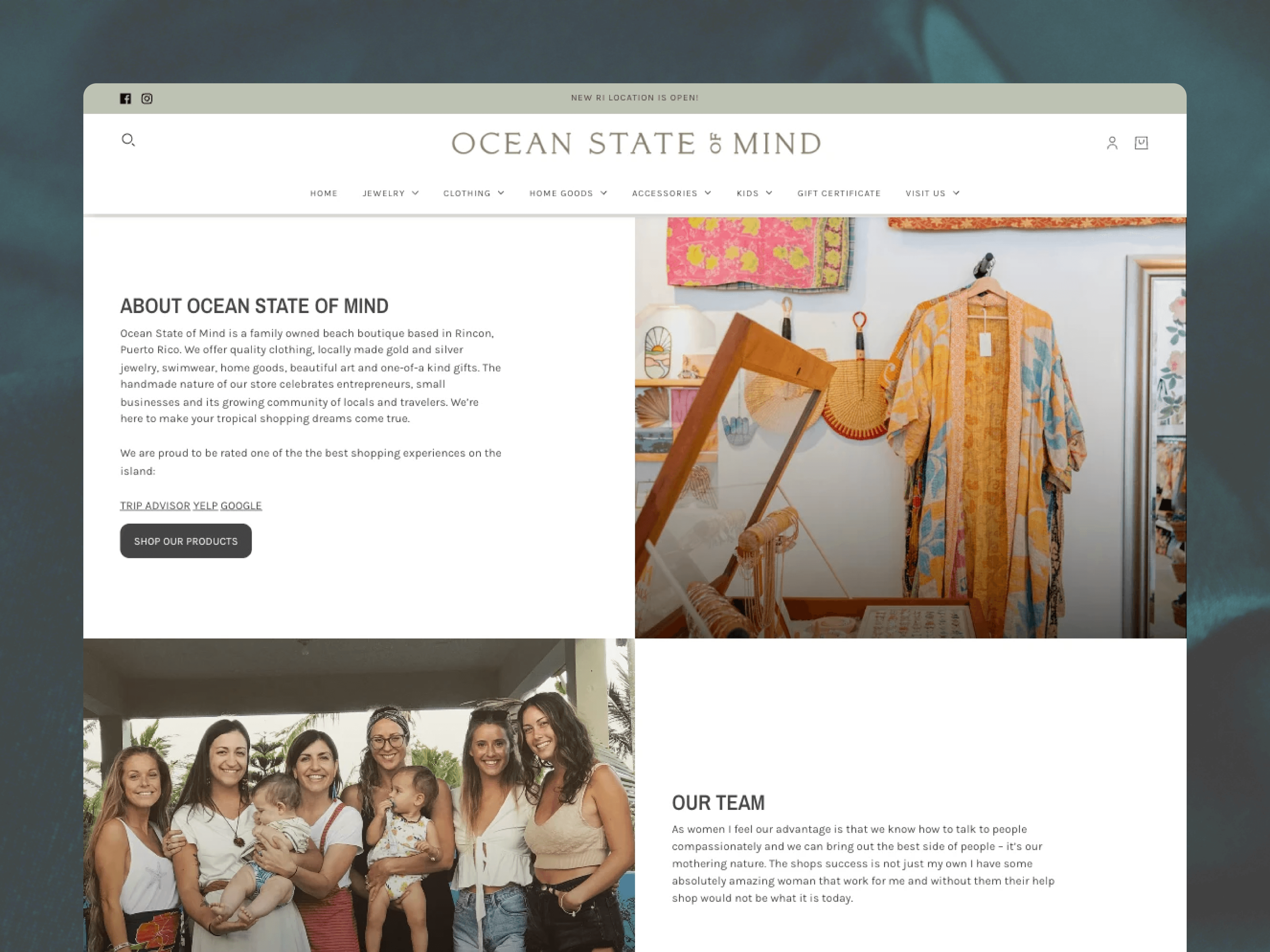 Ocean State of Mind is a cherished family-owned beach boutique with coastal locations in Rincón, Puerto Rico, and Wakefield, Rhode Island. More than a store, it's a destination for thoughtful shopping, offering a curated mix of quality clothing, locally made jewelry, unique home goods, and art. The brand celebrates entrepreneurs, small businesses, and the spirit of seaside communities, aiming to provide a welcoming, personalized experience that makes tropical shopping dreams come true.