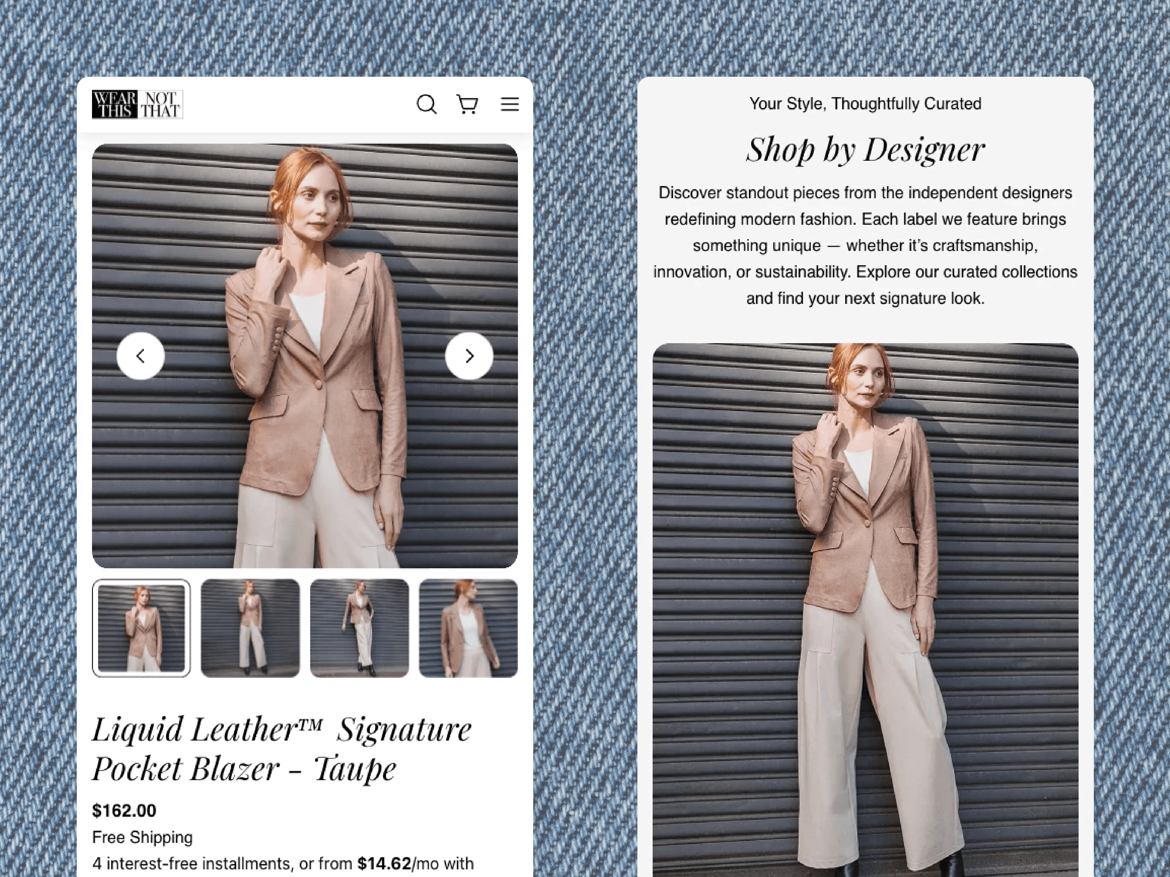 We partnered with Wear This Not That to create a bespoke Shopify store that emphasized storytelling, sustainability, and ease of navigation. Their product catalog was restructured into clear, shoppable categories, supported by an intuitive search and filtering system powered by Shopify Search & Discovery. The store was designed with a refined UX that balanced editorial-style storytelling with smooth e-commerce functionality, allowing customers to both explore the brand’s sustainable vision and shop effortlessly.